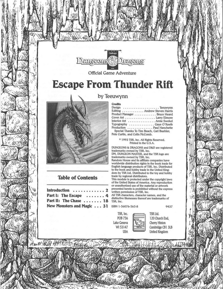 Escape From Thunder Rift je 32stránkové dobrodružství určené postavám na 5. úrovni v Basic Dungeons & Dragons, součást DMR1: Dungeon Master Screen. V první části dobrodružství jsou postavy požádány trpasličím vyslancem o pomoc s pátráním po mocném a nebezpečném kouzelníkovi Chambrinovi. V jeho skrýši (dungeon o 18 místnostech) objeví dimenzionální bránu, která je může přenést na Mystaru. Druhá část dobrodružství se pak skládá z lineárního pronásledování Chambrina na malém kousku divočiny ve velkovévodství Karameikos.