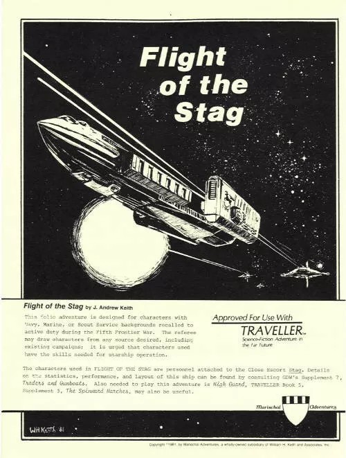 Flight of the Stag je krátké, 4stránkové dobrodružství pro klasický Traveller (1977). Postavy slouží na eskortní lodi Stag třídy Gazelle během páté pohraniční války a musejí se vypravit na tajnou misi. Budou unikat Zhodaniům a snažit se doprovodit imperiálního prince do bezpečí.