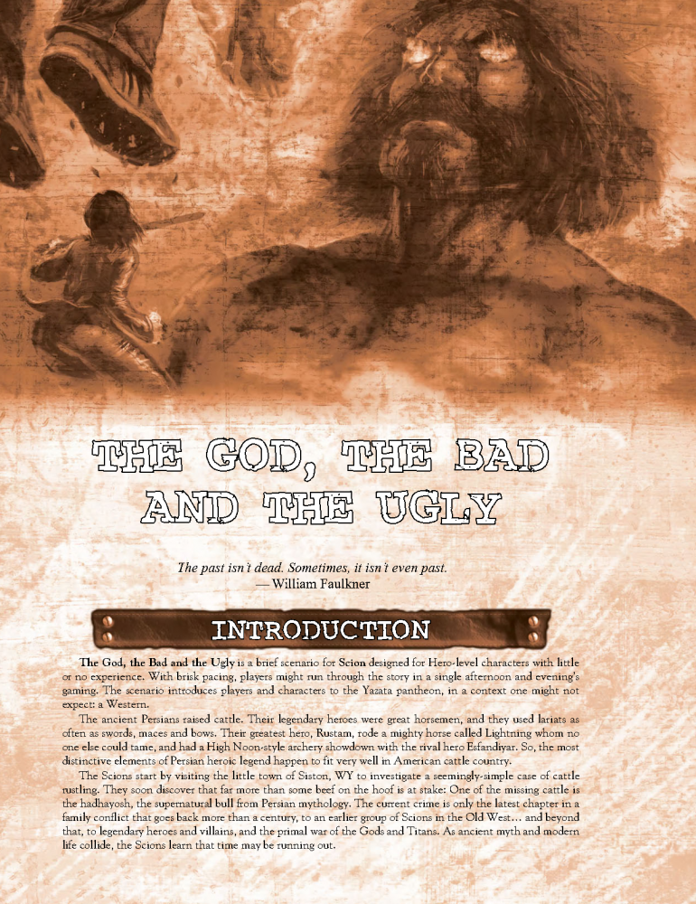 The God, the Bad and the Ugly je krátké dobrodružství pro postavy hrdinské úrovně s malou nebo žádnou zkušeností ve hře Scion. Je součástí příručky Yazata: The Persian Gods (2010). Skládá se ze 6 scén, každá má uvedenou předpokládanou náročnost pro fyzické, mentální a sociální výzvy.
