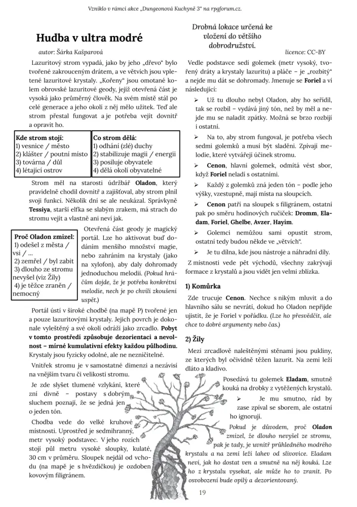 Hudba v ultra modré je dvoustránkové bezsystémové dobrodružství vytvořené v rámci designérského jamu Dungeonová kuchyně 2023 pořádaného RPG Fórem. Dobrodruzi v něm sestoupí do nitra čarovného stromu, který obývají malí golemci „mluvící“ monotónní řečí o jediném tónu. Něco je v nepořádku a hráči musejí situaci napravit. Jde o menší dungeon o šesti popsaných lokacích točících se kolem ústředního hudebního puzzlu.