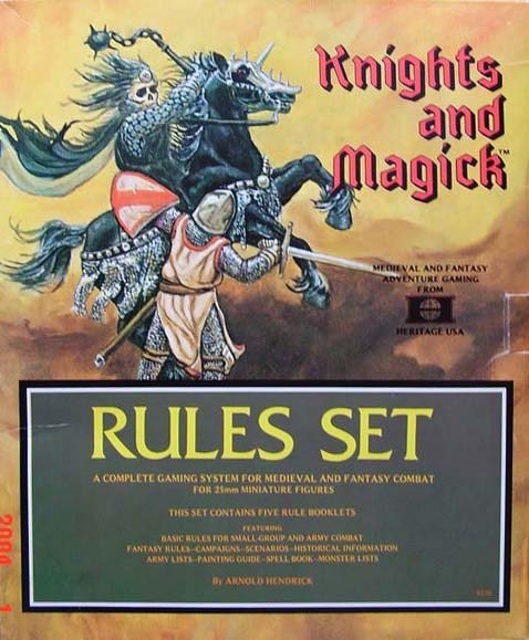 Knights and Magick je hra na pomezí wargame a RPG, která „začíná tam, kde roleplaying končí“. Poskytuje systém pro fantasy/středověké souboje s figurkami v měřítku jednotlivců i větších jednotek, jak v samostatných bitvách, tak jako součást delších poloticko-ekonomicko-vojenských tažení. Hráči do ní můžou vložit své postavy z Advanced Dungeons & Dragons (1978), Chivalry & Sorcery (1977) nebo DragonQuestu (1980) a pokračovat ve hře v tomto vyšším měřítku.