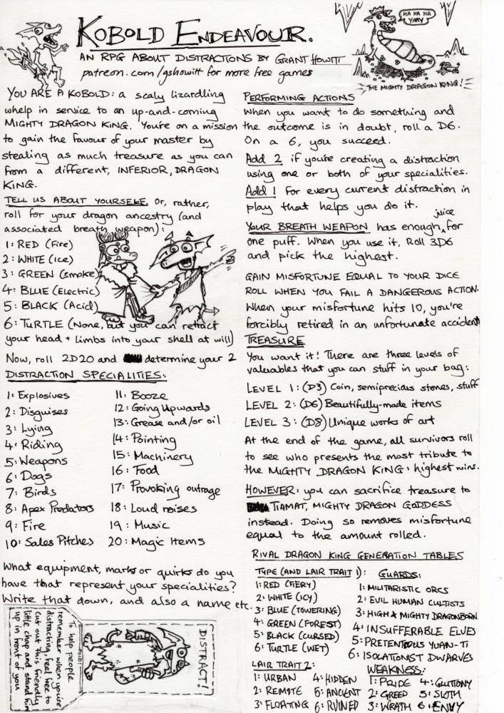 Kobold Endeavour je minimalistická, jednostránková hříčka, ve které se hráči stanou koboldy. Krutý a proradný Dračí král je pověří, aby se proplížili do pokladnice konkurenčního draka a nakradli, co unesou. Problém je, že koboldi jsou hrozně nešikovní.