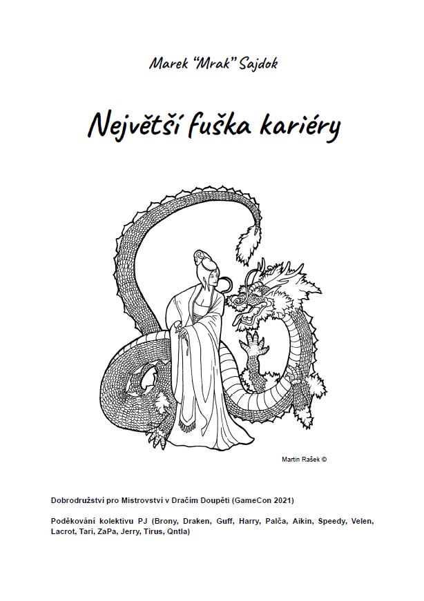 Největší fuška kariéry je soutěžní dobrodružství pro Dračí doupě (1990), vzniklé pro potřeby Mistrovství v Dračím doupěti na Gameconu 2021. Odehrává se ve fantasy světě inspirovaném Čínou osmého století, ve vyspělé asijsky laděné civilizaci disponující mocnou magií. Družina zkušených členů zločineckého syndikátu na 12. úrovni (kouzelníci na 10. úrovni) se v roli členů zločineckého gangu Bílého lotosu vydává uskutečnit největší fušku svého života, únos princezny.