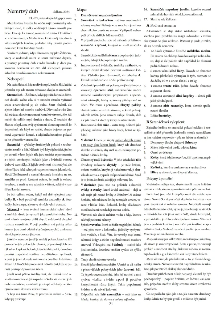 Nemrtvý dub je dvoustránkové bezsystémové dobrodružství vytvořené v rámci designérského jamu Dungeonová kuchyně 2023 pořádaného RPG Fórem. Dobrodruhy zavede do koruny obrovského stromu, ve kterém šílený druid experimentuje s nekromancií. Jedná se o netradiční „dungeon“ o 17 popsaných lokacích, kdy jednotlivé lokace jsou rozmístěné ve větvích stromu, které fungují jako „cesty“ mezi nimi.