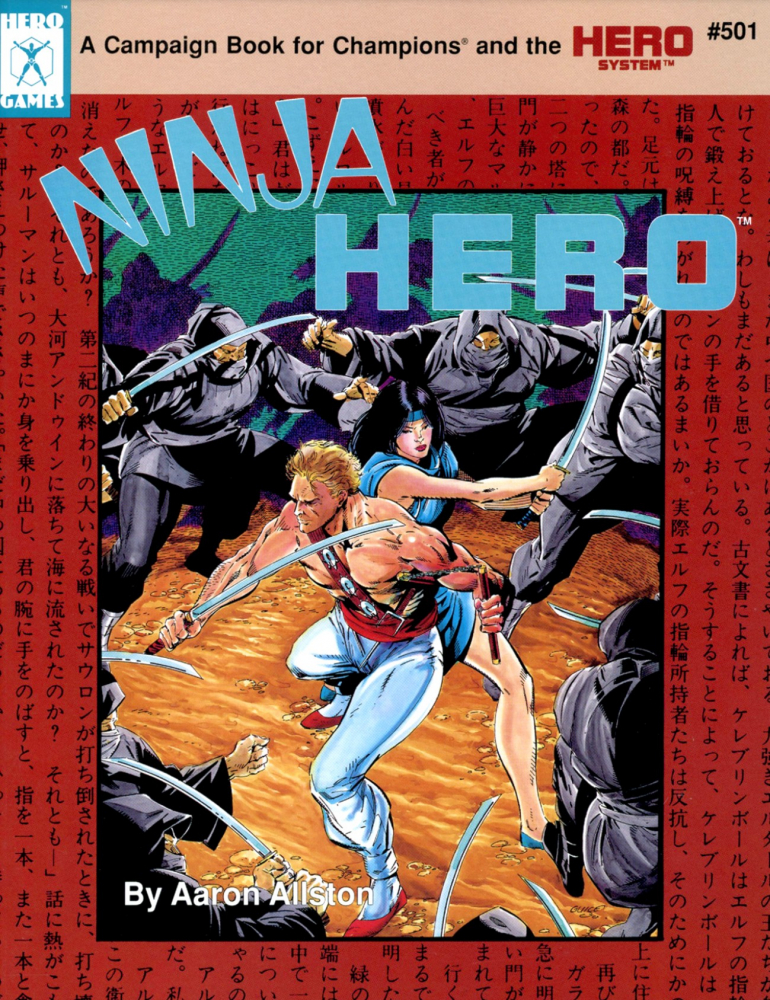 Ninja Hero je žánrové rozšíření pro čtvrtou edici Hero Systemu (1990), které do téhle univerzální hry přináší prvky bojových umění. 176stránková kniha popisuje přes dvě desítky různých bojových umění a 15 stylů kung-fu, související možnosti pro tvorbu postavy, systém pro používání speciálních manévrů v boji, ale taky nové zbraně a kusy vybavení. Vypravěči radí s vedením her ve stylu akčních filmů a nabízí tři krátké připravené scénáře.