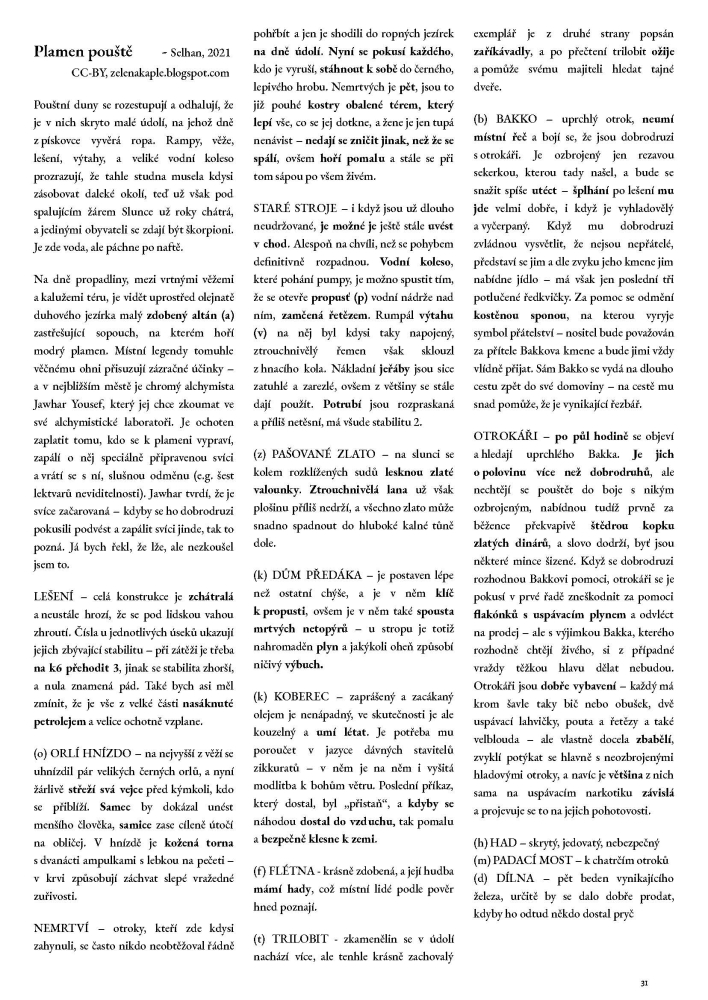 Plamen pouště je stručné, dvoustránkové dobrodružství bez určení pro konkrétní hru, které vzniklo v rámci tvůrčí výzvy RPG Fóra Dungeonová kuchyně 21. Jde o dungeon ve studni prosycené petrolejem.