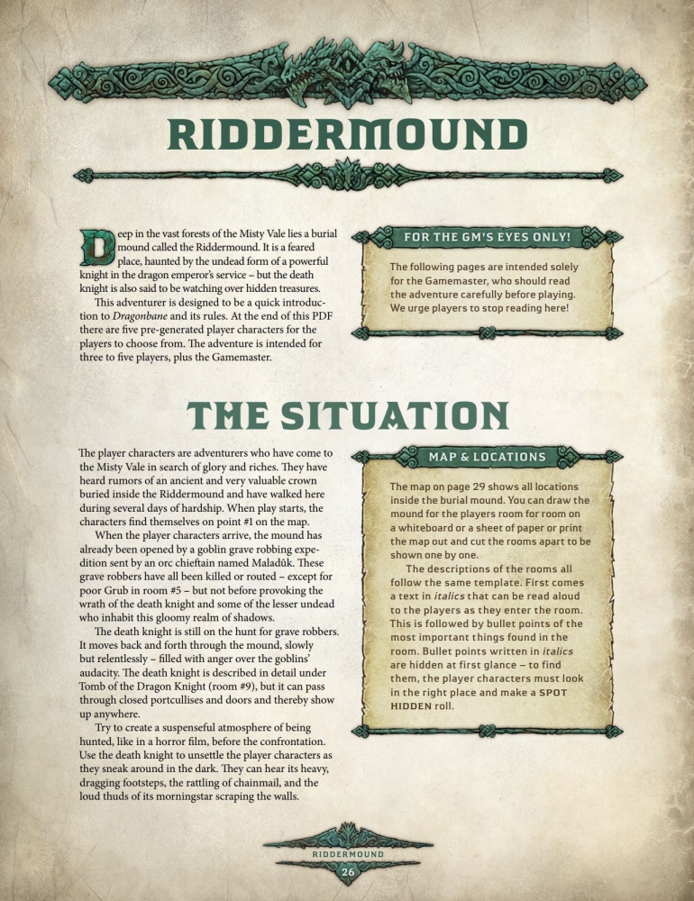 Riddermound (v českém překladu Mohyla dračího jezdce) je úvodní dobrodružství k desáté edici hry Drakar och Demoner / Dragonbane (2023), které vyšlo jako součást rychlého startu Dragonbane Quickstart (2022). Dobrodruzi zaslechli zvěsti o starobylé a velmi cenné koruně uložené uvnitř Hřebenové mohyly a vyrážejí ji prozkoumat. Jedná se o minidungeon se zhruba 10 popsanými lokacemi.