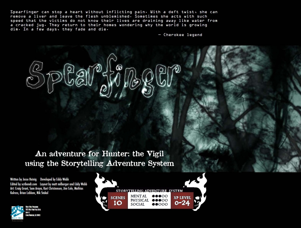 Spearfinger je příběh pro Hunter: The Vigil (2008) napsaný dle SAS. Je vhodný i pro začínající postavy. Ve městě se objevují úmrtí lidí, kterým najednou chybí orgány. Policie si neví rady a zůstává tedy na Lovcích, aby tomu zabránili. V průběhu vyšetřování se budou muset rozhodnout, komu věřit a komu ne.