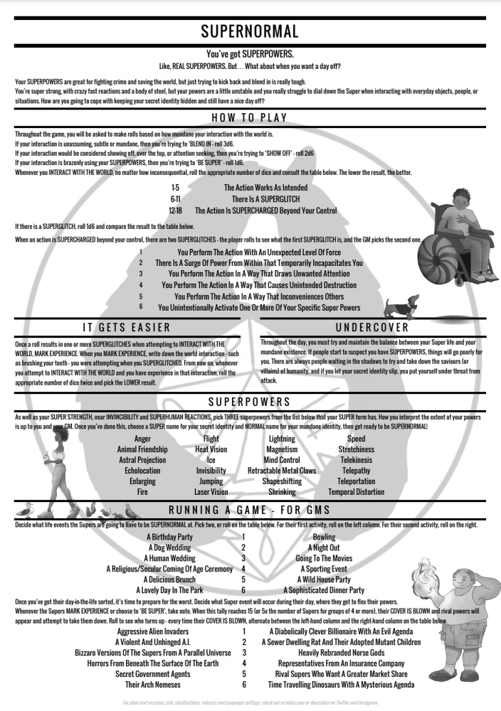 Hra je minimalistická, celá se vejde na jednu (hustě popsanou) stránku. Postavy si vyberou pár superschopností a pak se veškeré akce vyhodnocují jednoduchým hodem 2k6 nebo 3k6 proti fixní obtížnosti, kdy nejběžnějším výsledkem je úspěch se (super)komplikacemi. Spodní polovina stránky obsahuje jednoduchou tabulku herních situací určenou pro vypravěče.