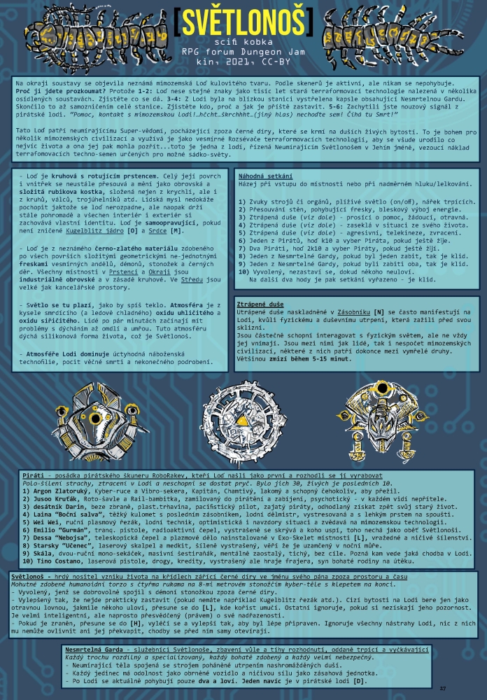 Světlonoš je stručné, dvoustránkové dobrodružství bez určení pro konkrétní hru, které vzniklo v rámci tvůrčí výzvy RPG Fóra Dungeonová kuchyně 21. Jde o vesmírnou loď zpracovanou do podoby dobrodružné lokace, které dominuje úctyplná náboženská technofilie, pocit věčné smrti a nekonečného podrobení“. Dobrodružství skoro jistě skončí smrtí všech postav a možná i několka okolních hvězdných soustav.