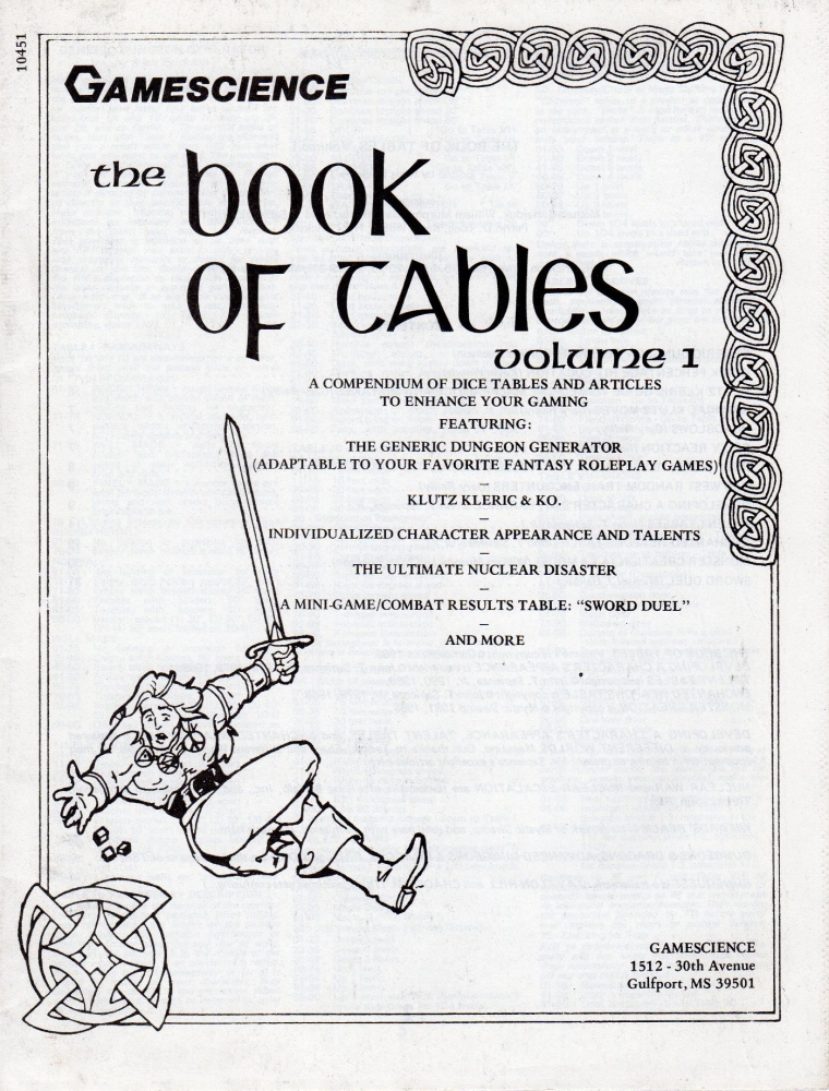 The Book of Tables, Volume 1 je 32stránkový, systémově neutrální sešit náhodných tabulek pro použití s libovolnou hrou. Umožňuje například určit vzhled postav a jejich talenty, obsahuje generátor jaderných katastrof, minihru pro náhodné určení šermířského duelu nebo generický generátor dungeonu.