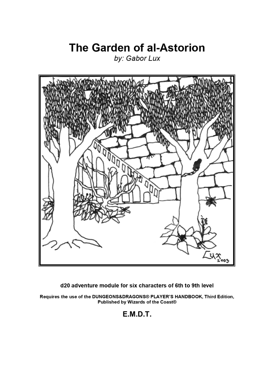 The Garden of al-Astorion je 44stránkové dobrodružství pro skupinu šesti postav na 6. až 9. úrovni v systému d20 (2000), respektive ve třetí edici Dungeons & Dragons (2000). Odehrává se v tropickém údolí o rozměrech asi 15 × 5 km, tvořeném 22 očíslovanými lokacemi, z nichž 6 jsou podrobněji rozepsané dungeony. Svébytnou variaci na ztracený svět obývají psioničtí opolidé, pravěká zvířata a smrtící rostliny, nachází se v ní jeskyně se zikkuratem plazího lidu, věž a hrobka mocného čaroděje nebo titulní ovocná zahrada spravovaná šíleným poustevníkem. Je jen na dobrodruzích, zda se rozhodnou vrátit zahradě její zašlý lesk, nebo si jen přisvojí její bohatství.