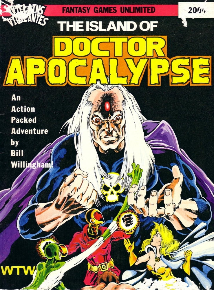The Island of Doctor Apocalypse je dobrodružství pro superhrdinskou hru Villains and Vigilantes, které se volitelně dá použít jako pokračování předchozího dobrodružství Death Duel with the Destroyers (1982). Po přemožení skupiny padouchů The Destroyers přicházejí dobrodruzi na ostrov samotného superzáporáka Dr. Apocalypse, aby se vypořádali i s ním. Mají na to necelý den, jinak záporák zničí největší americká města.