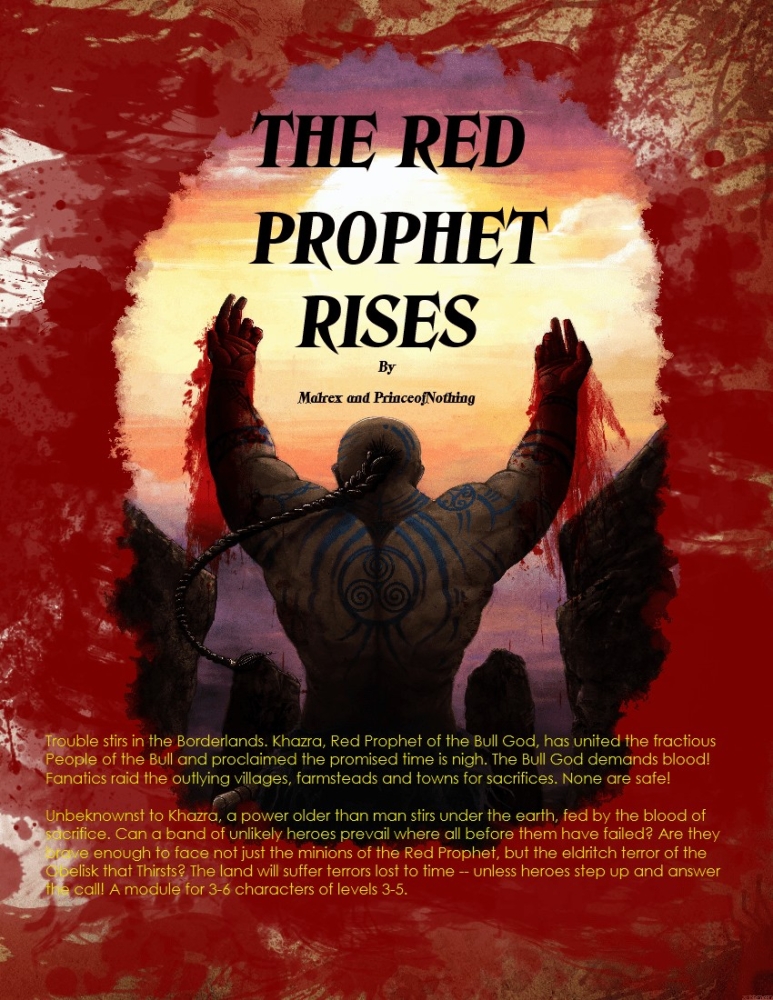 The Red Prophet Rises je dobrodružství pro postavy na 3. až 6. úrovni ve For Gold & Glory (2014) nebo jiných OSR retroklonech. Postavy se vypravují do rokle ve skalách, kde se shromažďují barbarské kmeny podnikající loupeživé nájezdy do okolí a unášející lidi na krvavé oběti. Rokle a přilehlé jeskyně ve skalách jsou pojaté jako dungeon o 43 popsaných lokacích.
