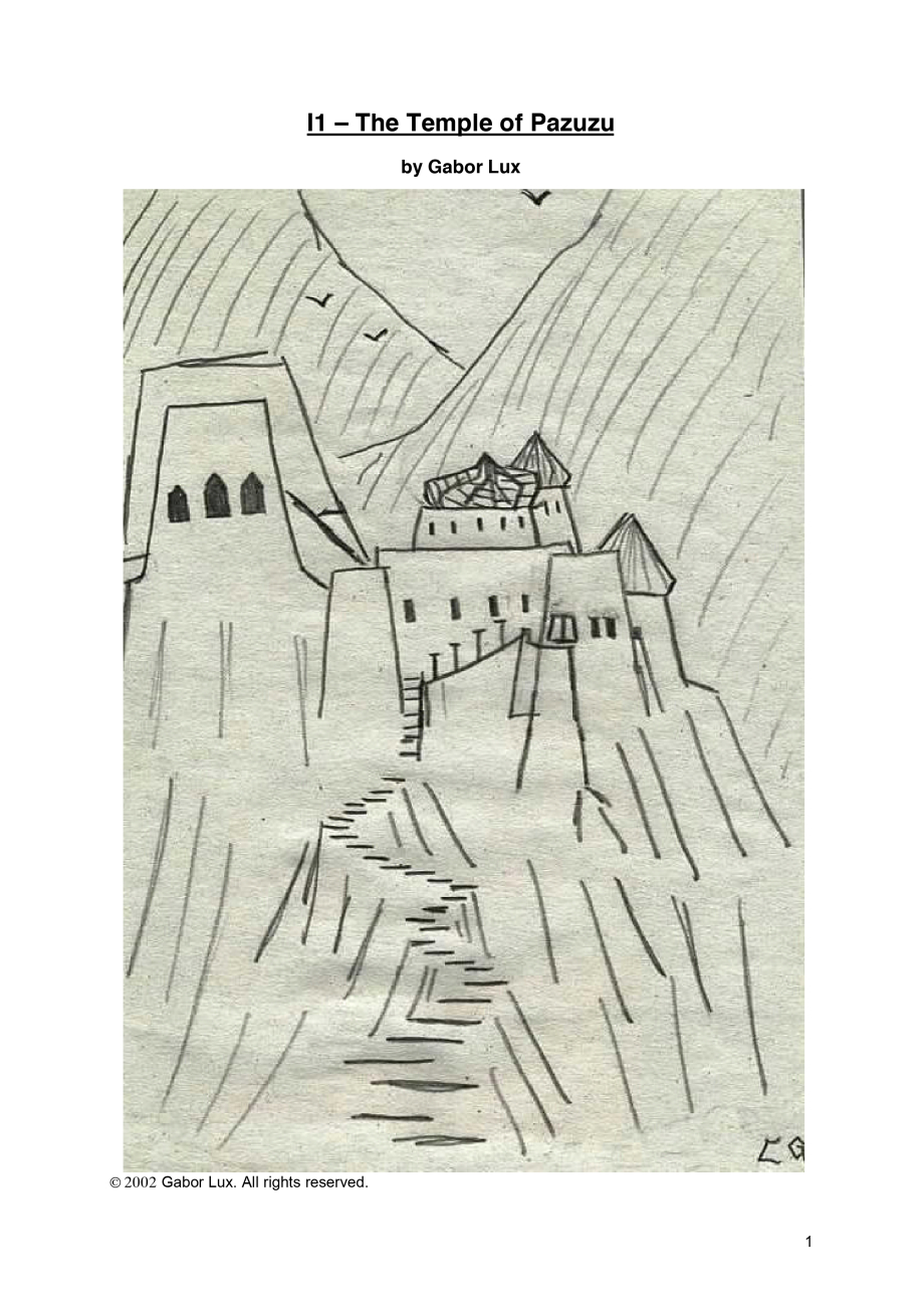 I1: The Temple of Pazuzu je 23stránkové dobrodružství pro skupinu 4 až 6 postav na 3. až 6. úrovni v d20 (2000), respektive třetí edici Dungeons & Dragons (2000). Odehrává se na tropickém souostroví, které dobrodruzi se základnou ve vesničce přátelských domorodců prozkoumávají ve formě hexcrawlu. Narazí při tom na další domorodé kmeny, lidožravé opice, dehtové zombie, pterodaktyly a především titulní chrám padlého boha, dungeon o 27 místnostech obývaný nemrtvými a posledními kultisty.