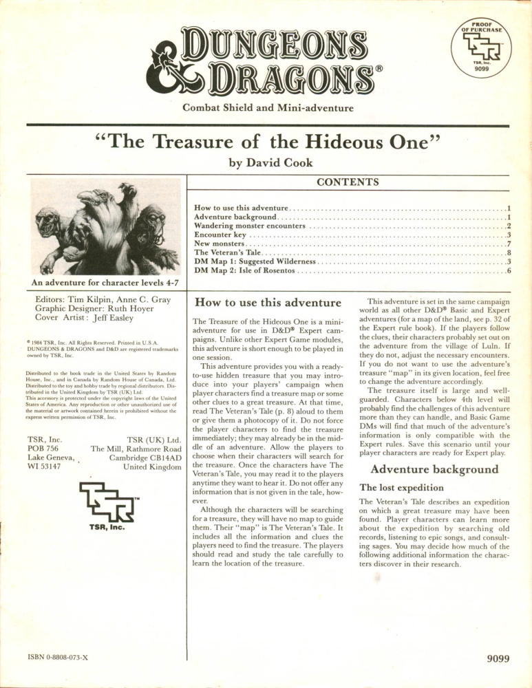 The Treasure of the Hideous One je 8stránkové dobrodružství určené postavám na 4. až 7. úrovni v Basic Dungeons & Dragons. Bylo součástí AC2: Combat Shield and Mini-Adventure (1984). Družina se dozví o bájném pokladu ukrytém kdesi v bažinatém kraji, vydá se proto po jeho stopách do močálu s šesti popsanými lokacemi, z nichž poslední je ostrov s 9 popsanými lokacemi a úkrytem antagonisty.