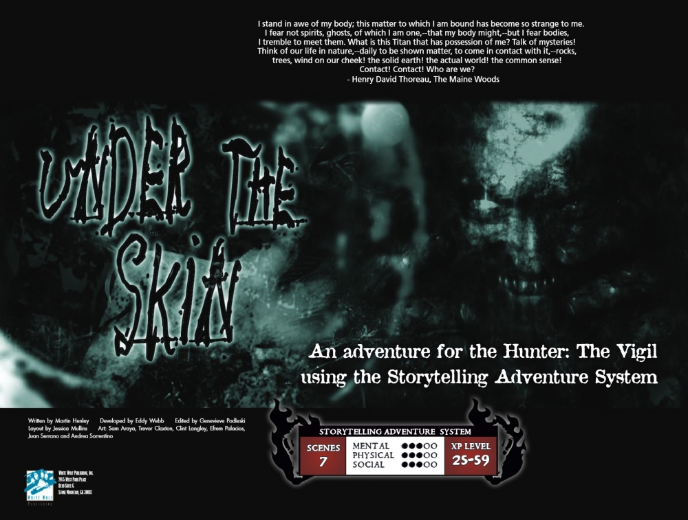 Under the Skin je příběh pro Hunter: The Vigil (2008) napsaný dle SAS. Je vhodný pro lehce zkušené postavy (25 až 50 xp). Někdo se pokoušel ovládnout entitu, které úplně nerozumí. Nyní je na Lovcích, aby tenhle problém vyřešili a zachránili nevinnou oběť.