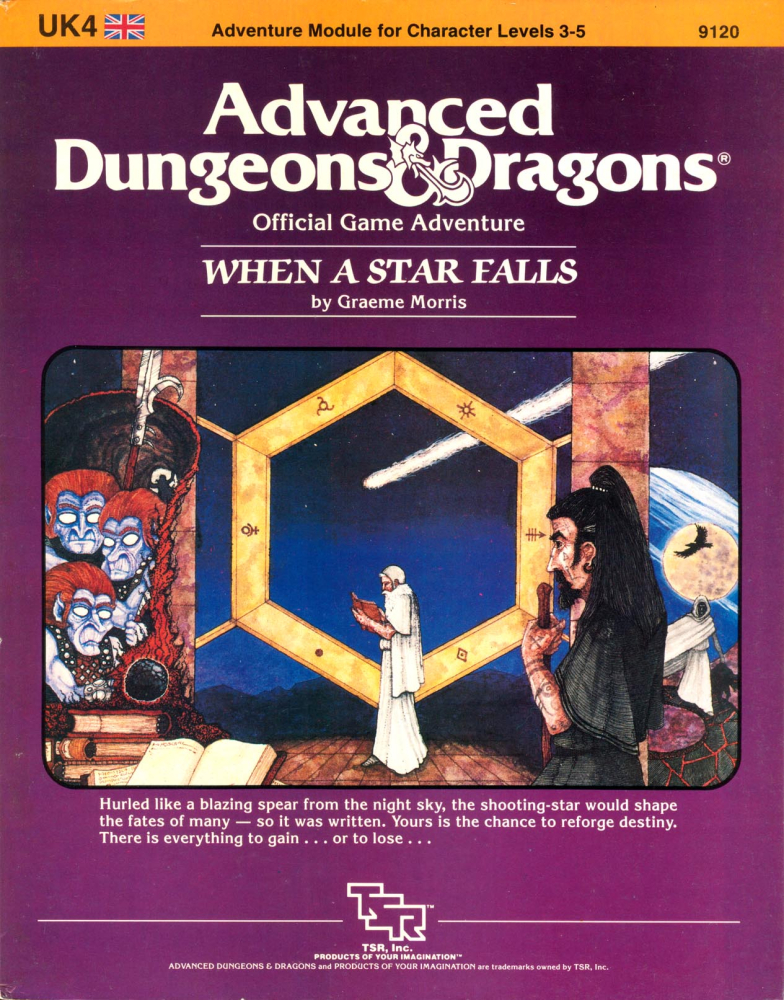UK4: When a Star Falls je 32stránkové dobrodružství určené postavám na 3. až 5. úrovni v Advanced Dungeons & Dragons (1978), čtvrté ze série UK – United Kingdom. V jeho úvodu se dobrodruzi utkají s paměťovou pavučinou, po jejímž poražení absorbují znalosti a útržky vzpomínek skupiny mnichů, kteří byli na výpravě za hvězdou spadnuvší na zem. Pokud se rozhodnou v misi pokračovat, v relativně volném putování divočinou hvězdu najdou, utkají se s dery, svirfnebli i draky a pomůžou zachránit mudrce z Nebeské věže před zkázou i vnitřními spory. Dobrodružství kombinuje volné cestování divočinou, sociální situace i klasické, bojově orientované dungeony.