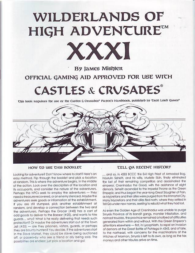 48stránková příručka XXXI popisuje císařské město Tell Qa. Jedná se o menší město o zhruba 3300 obyvatelích, ale je popsané jako kompletní prostředí pro městská dobrodružství, včetně informací o obyvatelstvu, kultuře, měně, obraně, důležitých postavách i jednotlivých zajímavých lokacích a setkáních. Město je sídlem nezvyklého monoteistického náboženství „mykreciánství“, jakési fantasy obdoby křesťanství a mithraismu, která je v mnoha částech světa Wilderlands nezákonná.