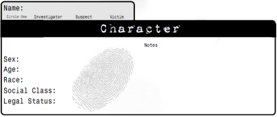Rozdáme kartičky postáv a začneme ich vypĺňať. Tri z týchto postáv budú označené navyše ako vyšetrovateľ, obeť a podozrivý. Každý človek pri stole vyplní jednu charakteristiku a následne pošle kartičku susedovi. Takto kartičky postupne kolujú, až kým nemajú všetky úvodné postavy vyplnené všetky charakteristiky. Teraz každý hráč pomenuje postavu, ktorú má pred sebou. Podľa odporúčania autora hry máme na stole najlepšiu príručku pre herné prostredie - telefónny zoznam. Keď sú všetci hotoví, nasleduje predstavenie a úpravy postáv.