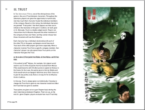 A nakonec hráči určí počáteční hodnoty Důvěry, což je jediná statistika ve hře. Důvěru si představte jako různobarevné žetony; každý hráč má svojí barvu a může dle libosti dávat důvěru jiným hráčům. Příběhově tím znázorňuje, kterak jeho postava důvěřuje postavě druhého hráče. Z hlediska Pravidel tím druhému hráči předává obrovskou moc. Jak už jsem říkal, hra je nastavena tak, aby si roninové museli navzájem pomáhat. Jenomže aby vám někdo mohl pomoci, musíte mu napřed předat nějaké ty body důvěry. Daný hráč vám kdykoliv může jeden bod vrátit, pomoci vám a tím vám přinést výrazný bonus k hodu. Nebo vám může kdykoliv jeden bod vrátit a zneužít důvěru proti vám – například vaši důvěřivou postavu naláká do léčky, vytáhne z ni choulostivé informace, uchlácholí ji sladkými lži, nebo ji prostě vrazí katanu do břicha. V takovém případě dostáváte výrazný postih. Je tedy velmi důležité pečlivě zvažovat, kterému roninovi můžete věřit a kterému ne. Špatné je, že někomu věřit musíte, jinak vám nebude nikdo pomáhat. Ještě horší je, že všichni přítomní mají očividně skryté agendy a temná tajemství. Není to snadná volba. Tím, že je důvěra jedinou statistikou ve hře, má také výsadní důležitost a nemůže se stát, že bude zastíněna čímkoliv jiným.