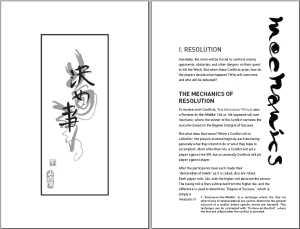 Systém různé míry úspěchu je zábavný a vytváří ve hře zajímavé situace. Bohužel jsme však při naší první hře zjistili, že je občas velmi těžké vymyslet vhodný kompromis, hlavně pak u smíšených úspěchů. Na tomhle místě je nutné smeknout před autorem, protože hra rozebírá vyhodnocování konfliktů na neuvěřitelných 20 stránkách a detailně vysvětluje, který hráč co říká, kdo má právo popisu, jak pracovat s mechanikami, jak interpretovat různé úspěchy, a tak dále. Za tohle má u mne Mountain Witch čestné uznání, v žádné jiné hře jsem se s tím nesetkal. A ačkoliv bych tak ještě jednu, dvě rady navíc uvítal, s pomocí doprovodných textů a po chvíle praxe si tuto mechaniku rychle osvojíte. Hra se trochu zadrhává u skupinových konfliktů a například my jsme byli celkem zmatení, než jsme se je naučili dobře zvládat. Mechaniky jsou v pořádku, ale chtělo by to lepší doprovodný text. První mínus. Samostatný soubojový systém ve hře neexistuje a autor žertovně prohlašuje, že každý konflikt je svým způsobem souboj. A má pravdu – v jakémkoliv konfliktu se dají volně převádět úspěchy (resp. neúspěchy) na zranění. Například výše zmíněný smíšený úspěch bych mohl popsat rovněž tak, že se mi sice můj cíl stoprocentně podaří, ale utrpím při tom jedno drobnější zranění. Souboj je tudíž konflikt jako každý jiný a zároveň každý konflikt je soubojem. Zranění je pouhý postih (-1) ke všem konfliktům, jichž se postava účastní. V závislosti na velikosti zranění se měří délka jeho trvání – nikoliv v reálném čase, ale ve scénách nebo sezeních. Aby byly postavy (ať už hráčské či nehráčské) vyřazeny z konfliktu, musí jim někdo způsobit zranění ekvivalentní určité míře úspěchu. Ty nejslabší protivníky lze vyřadit běžným úspěchem (výhra o 3), na ty nejsilnější platí jedině úspěch dvojitý (výhra o 5). Drobnější zranění se samozřejmě sčítají, takže postihů postupně přibývá. Zcela geniální je specialitka v podání čestného samurajského souboje na život a na smrt. Rychlá mechanika, maximálně tři hody, na konci padá některá postava mrtvá k zemi. Je to skutečně věc, kterou použijete jen párkrát za hru, ale když na ni dojde, budete doslova vdechovat patos. V kůži Šintara Šira, mé nepříliš kladné postavy, jsem na konci hry zradil svého společníka a přidal se k čaroději. Bohužel jsem bláhově věřil na čest a nechal jsem se od bývalého parťáka vyzvat na souboj. Zemřel jsem. Ale závěr hry to byl špičkový.