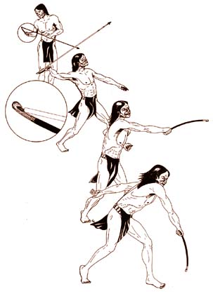 Už první lidé dnešního typu vymysleli „prodlouženou ruku“ k vrhání oštěpů; většinou znalost jeho výroby a používání časem zapomněli, ale třeba u středoamerických Indiánů se jeho znalost udržela až do doby po příchodu Evropanů. Střelec si položil oštěp na rameno a zahákl jej do zvláštní dřevěné tyče. Vrhnutí chtělo trochu cviku, ale vystřelený oštěp dolétl mnohem dál než bez použití vrhače, a i jeho síla byla větší.