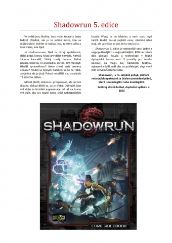 Shadowrun je hra kombinující vysokou fantasy s kyberpunkem v blízké dystopické budoucnosti. Tato pátá edice nepřinesla tolik změn jako čtvrtá edice (2005), spíše jejich začištění. Hra se odehrává v populárním fikčním světě, tentokrát roku 2075. Jde o ponurou dystopickou budoucnost, ve které se snoubí vyspělá technologie s magií, ve světě ovládaném megakorporacemi, kde je možné cokoliv a přesto valná většina nemůže nic. Shadowrunneři jsou nájemní agenti pohybující se stíny na pomezí vysoké politiky, korporační špionáže, zločinu, podsvětí a všeho možného.