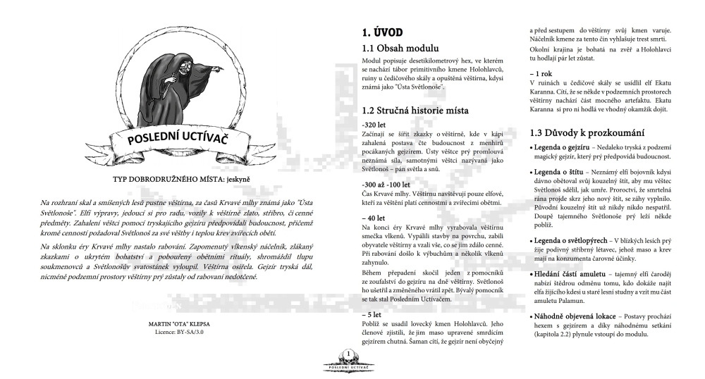 Ota se vyhnul častému neduhu, kdy autoři dobrodružství přijdou s nápadem, ale implementaci nechají na mě (případně vymyslí faktografii a pak mě nechají, ať si s tím dělám, co chci). Ota implementuje všechno s až obsedantní pečlivostí. Když zmíní pazourkové zbraně, hned následuje jejich pravidlový efekt. Když zmíní, že kosti mrtvých se rozvěšují v pytlech na stromy okolo vesnice, hned do hry „umístí“ jedno setkání s takovým pytlem a jeho strážci. Když zmíní požírání nebožtíků, hned to rozvíjí v náhodných drbech a pro jistotu ještě přidá vedlejší postavu, která tenhle motiv rozvíjí. Tae prosím vypadají připravené podklady pro hru!