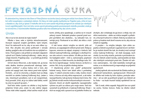 Frigid Bitch, ve slovenštině Frigidná Suka, působí jako nevinná hříčka pro vyblbnutí, když zrovna máte s kamarády dlouhou chvíli a nechce se vám hrát nic "vážnějšího". Minimum textu, minimum pravidel, minimum přípravy, trocha zábavy :) Samotný nápad s výletem do zámku ledové královny slibuje zajímavé zážitky, ale provedení pravidel trochu pokulhává. Text mě místy mátl, chybí jakékoliv příklady nebo srozumitelné instrukce. Ale co bych chtěl? Vždyť je to příspěvek do soutěže ve stylu RPG kuchyně, napsaný sotva za pár dní, nelze tudíž čekat zázraky. Přečtení přesto rozhodně doporučím. Frigid Bitch má asi pět stran, je přeložená do slovenštiny a čtení rozhodně není ztrátou času. Za pokus nic nedáte.