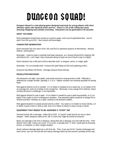 Rodina D&D má množstvo klonov - niektoré väčšie, niektoré menšie. Za Dungeon Squad sa skrýva snaha získať feeling preliezania jaskýň a bitia príšer spôsobom, ktorý "je výslovne navrhnutý pre mladých hráčov, ktorí nevedia udržať pozornosť, ale túžia po akcii a zábave." Na troch stranách sa toho nedá opísať veľa, ale originálny je motív, podľa ktorého počet strán kocky hodnotí veľkosť. Žiadne prideľovanie bodov do Tela, Mysle a Krásy, ale pridelenie k6, k8 a k12 do vlastnosťo-povolaní Bojovník / Kúzelník / Zlodej. Sila zbraní a výzbroje je hodnotená v podobnom duchu - veľkosťou kocky, ktorou sa hádže pri jej použití. A to je vlastne všetko, pretože zvyšné dve strany zaberá povinný inventár, zoznam kúziel a protivníkov. Napriek tomu však vidieť priestor pre rozširovanie pravidiel, o čom svedčí množstvo dodatkov užitočných aj pre iné žánre. Úlohu Dungeon Squadu vidím presne v prípadoch, keď si zabudnete všetky príručky D&D a napriek tomu chcete hrať. Tie pravidlá jednoducho budete držať v hlave. Ale nie-úplne-okopírovaný dizajnérsky prístup si zaslúži oproti širokej paleta podobných trojstranových súputníkov o hviezdičku viac.