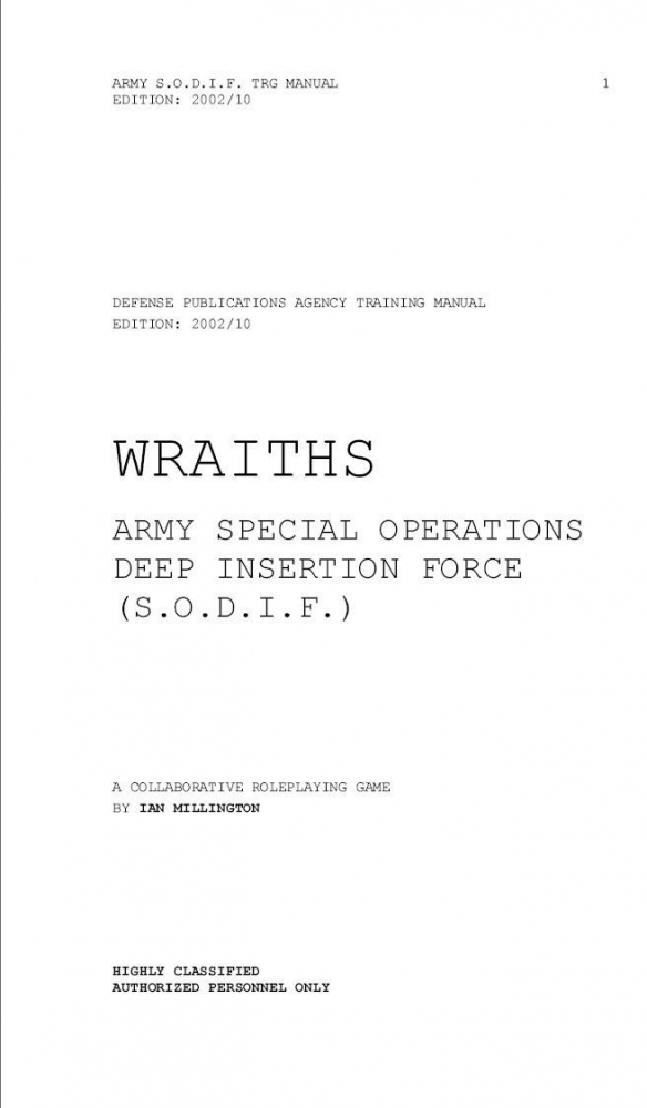 Wraiths je hra na členy tajné elitní vojenské jednotky. S.O.D.I.F., běžně zvaní Wraiths mají globálních dosah a specializují se na sabotáže, průzkum a záchranné operace. Je pravidlově minimalistická a soustředí se na minimum potřebných informací ke kolaborativnímu vyprávění takového příběhu.