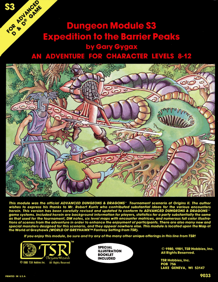 S3: Expedition to the Barrier Peaks je vůbec první dobrodružství pro RPG hry, které zkombinovalo fantasy s prvky sci-fi. Je inspirované hrou Metamorphosis Alpha (1976) a spekuluje, jaké by to bylo, kdyby se do tradičního fantasy světa zřítila generační vesmírná loď. Dobrodruzi z AD&D na 8. až 12. úrovni se v něm vypravují do záhadného podzemí, které je ve skutečnosti vesmírná loď o šesti poschodích, a objevují v něm neznámé technologické zázraky. Zhruba polovinu rozsahu 70stránkové publikace zabírají ilustrace sci-fi tvorů a artefaktů.