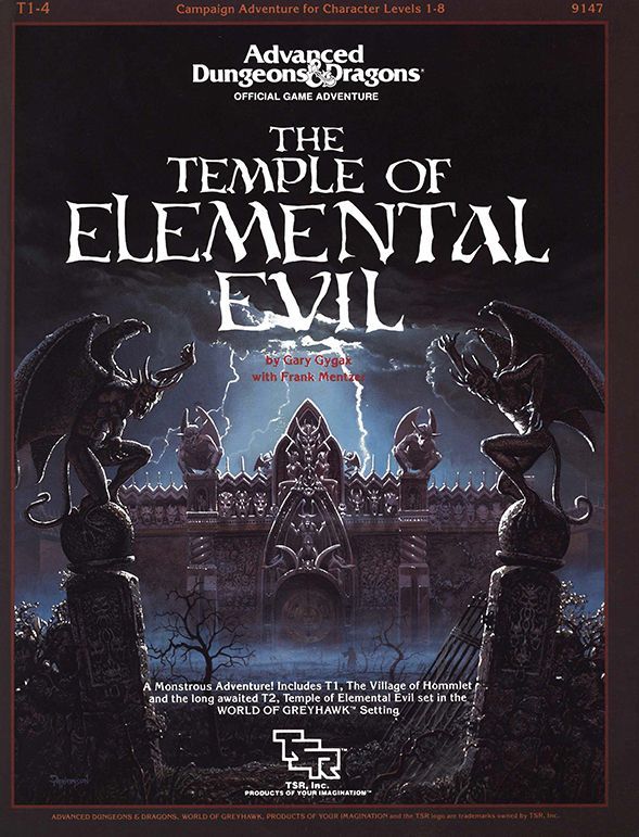 T1–4: Temple of Elemental Evil patří k nejslavnějším dobrodružstvím z historie D&D. Jde o rozsáhlou kampaň pro 1. až 8. úroveň. Obsahuje kompletní modul The Village of Hommlet sloužící jako úvod kampaně, ve kterém hráči osvobodí tvrz od banditů a usídlí se v ní. V další části se přesouvají nedaleké vesnice Nulb, ve které se střetávají s nepřáteli z Chrámu živelného zla, a potom pokračují průzkumem rozsáhlého podzemí pod samotným chrámem. To má rozměry menšího megadungeonu.