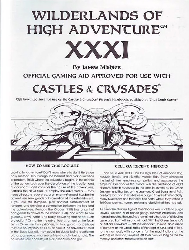 48stránková příručka XXXI popisuje císařské město Tell Qa. Jedná se o menší město o zhruba 3300 obyvatelích, ale je popsané jako kompletní prostředí pro městská dobrodružství, včetně informací o obyvatelstvu, kultuře, měně, obraně, důležitých postavách i jednotlivých zajímavých lokacích a setkáních. Město je sídlem nezvyklého monoteistického náboženství „mykreciánství“, jakési fantasy obdoby křesťanství a mithraismu, která je v mnoha částech světa Wilderlands nezákonná.